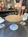 Table tulipe ronde plateau plaqué effet chêne et piètement en métal blanc.